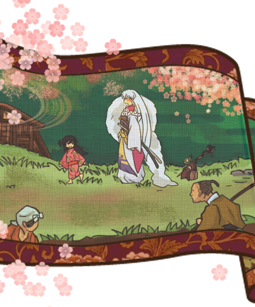 春爛漫の椿事(ちんじ) ※この画像は『妖ノ恋』さまの了解をえて公開しております。冬の終わりをつげる梅が咲いた。そして散った。陽光の化身のような菜の花はずっと咲き続けている。しばらくして本格的な春の訪れをつげる桜が咲いた。桃も負けじと咲きだした。桜色と桃色、濃淡の違う淡紅色の花弁が艶やかさを競うように咲き誇る。隻眼の老女、巫女、楓の守る村は、今、春を彩る花々に覆われている。春の訪れに村人の表情も明るい。畑仕事にも精がでる。そんな春爛漫の村里をのんびりと歩く珍妙な三人連れがいる。その一行に目をとめた吾作は農作業のかたわら女房のお花に話しかけた。吾作「おい、かかあ、見ろや。ま~た、あの御仁が来とるぞ」お花「ん? あぁ~~殺生様かい。りんちゃんに逢いにきなすったんだね。腰巾着(こしぎんちゃく)の邪見も一緒だ」五つか六つだろう。可愛らしい女児がはずむような足取りで村の中を先導している。その後から堂々たる美丈夫と緑色の小妖怪がついていく。女児の名は『りん』。つい先日、この村を守る隻眼の巫女、楓が預かった幼子である。美丈夫は『殺生丸』というらしい。いつの間にか村に居付いた犬夜叉の兄との触れ込みだ。犬夜叉は半妖だが兄の殺生丸は純粋な妖怪らしい。というのも犬夜叉の母親は人間だが殺生丸の母親は違うのだ。いわゆる異母兄弟とかいうやつである。そのせいだろうか。身にまとう雰囲気が兄と弟では天と地ほども違う。犬夜叉は野育ちのせいか基本的に粗野で物言いも荒っぽい。それに比べ殺生丸は生まれも育ちも本物のお殿様である。やることなすこと全てが貴族的で洗練されている。それもあって村人は恐れ多くて殺生丸の傍にもよれない状態だ。とはいえ殺生丸も犬夜叉も白銀の髪と金の瞳である。同じ色合いが嫌でも両者の血の繋がりを感じさせた。柔らかな陽射しの中、長身の妖怪はゆったりと歩をすすめる。右肩を覆う豪奢な白銀の毛皮が陽光をはじいて眩しい。厳(いかめ)しい妖鎧、雅(みやび)な流水文様の飾り帯、風にはためく艶(あで)やかな振袖。溜め息がでるほど見事な若武者姿である。腰には対照的な二振りの長刀を帯びている。ひと振りは漆塗りの黒鞘におさめた天生牙。もうひと振りは雷紋が施された白木の鞘の爆砕牙。『慈悲』を象徴する天生牙と『非情』の爆砕牙、それは殺生丸の本質でもある。白銀の大妖は相反する資質を同時に有する稀有な存在でもあった。サクッ サクッ サクッ静かに草を踏みしめて歩く殺生丸。何気ないひとつひとつの所作が流れるように美しい。そして何物にも動じない悠揚せまらざる態度。いかにも上つ方(=貴人、身分の高い人)らしい。そんな美貌の主(あるじ)の後をチョコチョコと小走りで追いかけるのはお供の邪見。いわずと知れた殺生丸の従者である。ギョロリとした出目、尖った嘴(くちばし)のような口許、緑色の矮小な体躯。蛙なのか河童なのか、はたまた鳥か、実に判断に苦しむ。なんとも奇妙な風体(ふうてい)の小妖怪である。それでも従者らしく焦げ茶色の水干を身につけ、禿げ頭にはチョコンと烏帽子(えぼし)を乗っけている。片時も手離さないのは翁と女の頭がついた不気味な杖、人頭杖である。お花「そういや、お前さん、聞いたかい? 村外れの袂橋(たもとばし)でのこと」お花は亭主の吾作に、先頃、村でもちきりの噂話をはじめた。袂橋とはこの村と隣村の間に流れる川に掛けられた橋である。川そのものが境(さかい)になっているのだ。昔、話し合いの結果、橋は二つの村が協力してかけられた。それゆえ、橋のど真ん中が村と村との境だと決められている。吾作「あぁ、何かあったんか?」お花「それがさあ、聞いておくれよ。村の悪たれどもが、りんちゃんにちょっかいかけたんだって」吾作「悪たれどもっつうと、あれか。村長(むらおさ)んとこの一郎太と近頃よくとつるんでる洟垂(はなた)れの餓鬼どもか」お花「そうそう、あの馬鹿どもったら、隣村への御用をいいつかったりんちゃんを袂橋んところで通せんぼしたんだってよ」吾作「はあっ、何だってそんなことを?」お花「そりゃ、決まってるだろ。りんちゃんの気を惹きたかったんだよ」吾作「へっ?」お花「鈍いねえ、あんた。一郎太は可愛いりんちゃんと仲良くなりたかったのさ。でも、あの年頃は、中々、素直にゃなれないからね。それで粋(いき)がって仲間と意地悪したんだよ」吾作「あいつら、まだ十(とお)にもならない餓鬼じゃねえか」お花「餓鬼は餓鬼でも男は男ってことさ。りんちゃんは鄙(ひな)には稀な器量よしだからね。早目に粉かけとこうってんだろ」吾作「けっ、餓鬼が一丁前に色気づきやがって。それで、どうなったんだ?」吾作がそう聞いた途端、女房のお花はゲラゲラと笑い転げた。腹を抱えて大笑いである。爆笑といってもいい。笑いすぎて目尻には涙までにじんでいる。お花「あははっ、そっ、それがさ、笑えるんだよ。殺生丸さまがいきなり現れて馬鹿ども