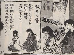 弥勒:破戒僧の系譜 ※アニメ「犬夜叉」&「奥義皆伝」からお借りしてます。上の画像は皆さまも御存じの弥勒です。弥勒は法師です。法師は僧侶に対する呼称の一つです。その弥勒の右手に穿たれた『風穴』。あれは武器であると同時に呪いでもあります。それも祖父からの因縁によるものです。弥勒を見れば分るように祖父も僧侶でありながら無類の女好きでした。そして、それが災(わざわ)いしました。生臭坊主(なまぐさぼうず)の弥勒祖父、美女に化けた(憑依した?)奈落に惑わされ退治どころか逆に呪いを受けてしまうという結末でした。おまけに、その呪いは自分ばかりか子々孫々まで続くというのです。弥勒一族の非業な運命の始まりです。その結果、弥勒の父は自(みずか)らの風穴に呑み込まれて亡くなりました。原作には描かれてませんが祖父の最後も同様だったのでしょう。ここで一つ疑問が生じます。何故、弥勒の祖父は子供(弥勒の父)を作ったのか???と。女犯(にょぼん)は勿論、破戒(はかい)です。自分だけならまだしも、わざわざ子供にまで呪われた運命を負わせるのは酷じゃありませんかね???だって、呪いのせいで子供は生まれながらに風穴をもって生まれてくるんですよ。弥勒の父にも同じことが云えます。正(まさ)しく「親の因果が子に報い~~~♪」です。それとも、そうまでして奈落を倒す使命を子孫に託したかったのか???そこが管理人には解(げ)せません。まあ、そんなこと云ってたら弥勒が生まれてこないんですがね。もし、そうなっていたら『犬夜叉』の話自体が全く違ってしまいます。ですから、これ以上の追及はやめておきます。でも、色々と身勝手な性分の爺さまだなあと思うのです。【女犯(にょぼん)】:僧が戒律を犯して女性と肉体関係をもつこと。【戒律(かいりつ)】:①(仏)出家者・在家信者の守るべき生活規律。「戒」は自立的に守ろうとする心の働き。「律」は他律的な規則。②一般に宗教における生活規律。拍手を贈ってくださった方々に感謝いたします。有難うございます。ブログ運営のパワーの源(みなもと)になってます。嵯峨野すみか様コメント有難うございます。自分なりの解釈を講じていると、ふいに今まで思いもしなかった考えが浮かんできたりします。それが創作につながることもあります。未完の作品を完成させるため、少しづつでも頑張ろうと考えてます。とっても励みになってます。重ねて御礼申し上げます。 [4回]